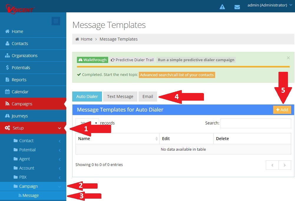 The first part of creating a new Email Campaign Message is to head over to the Messages directory. This is done by navigating to Setup > Campaign > Message as seen below. Once you’ve done this, you’ll want to select the Email tab at the top of the page. Now click “+Add” to make a new email campaign message. (see picture below)